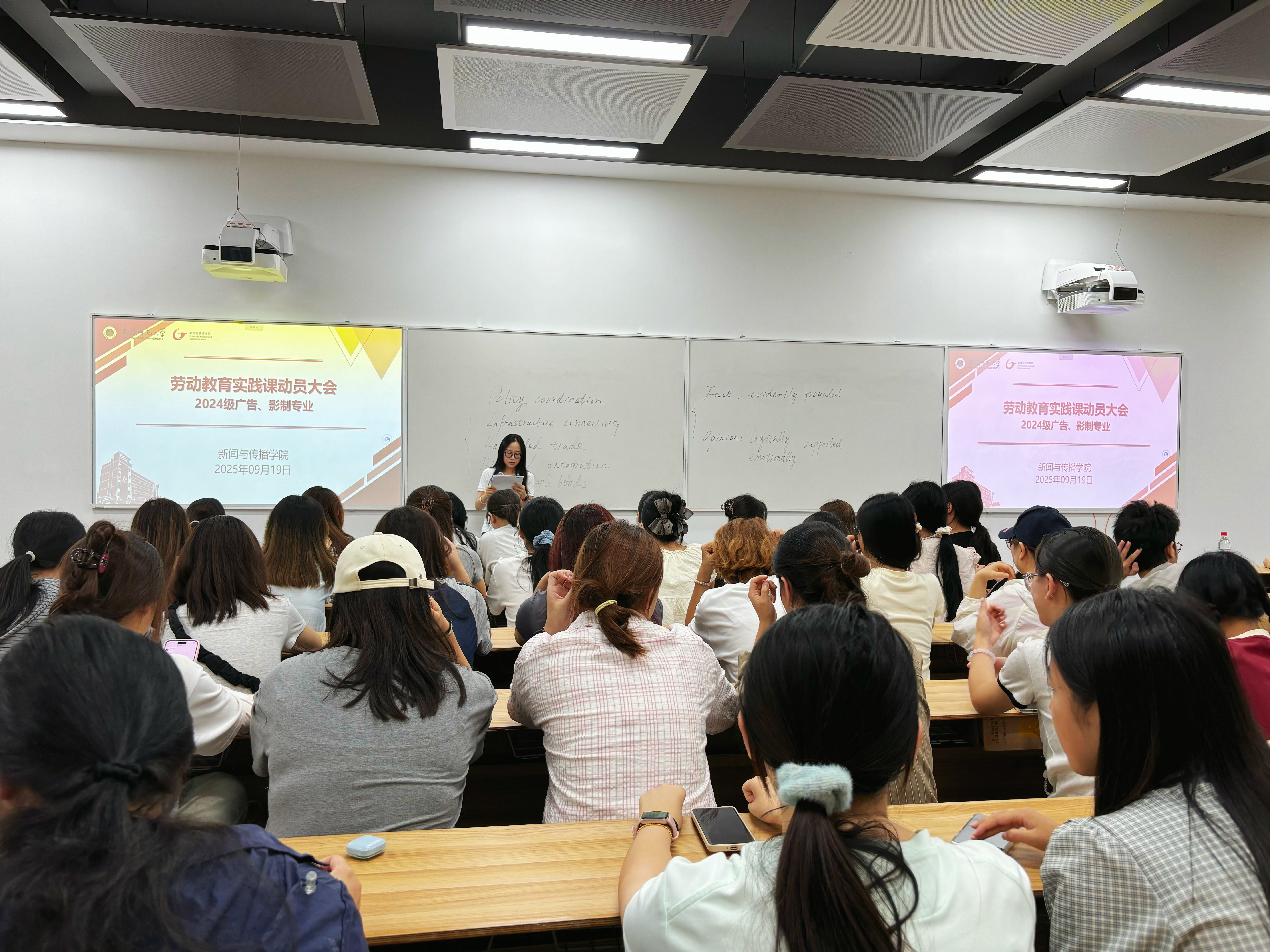 为全面落实学校劳动教育相关安排,保障迎新工作有序开展,9月19日,新闻与传播学院2024级影制、广告学专业于望道楼A101教室召开劳动周动员打会暨迎新工作布置会议。会议由辅导员乌思琦主持,24影制、广告学全体学生参加。