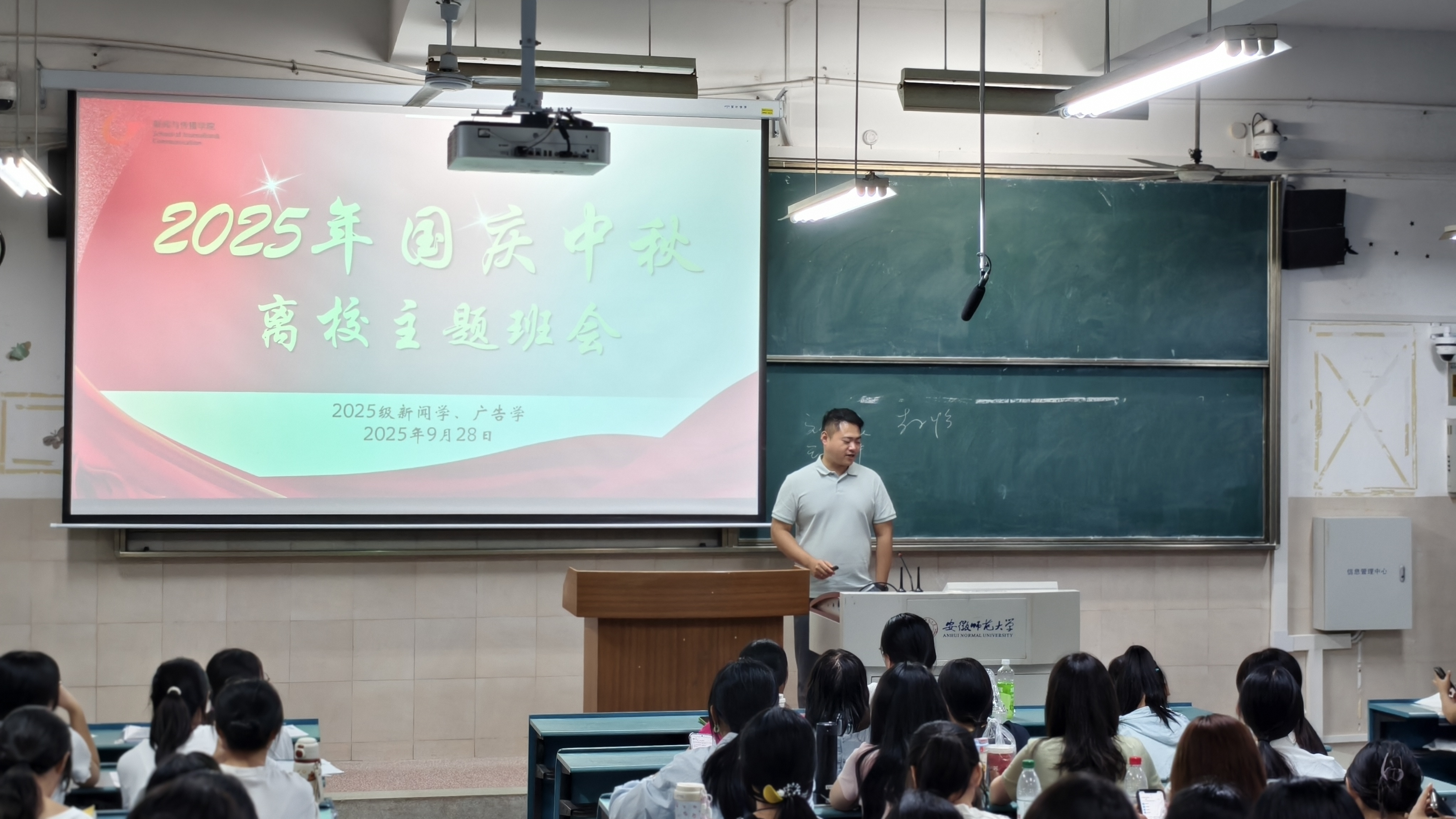 本网讯(新闻与传播学院 李默)9月28日,2025级新闻学、广告学专业在行知楼教室开展双节离校主题班会,由辅导员刘成俊老师主持。