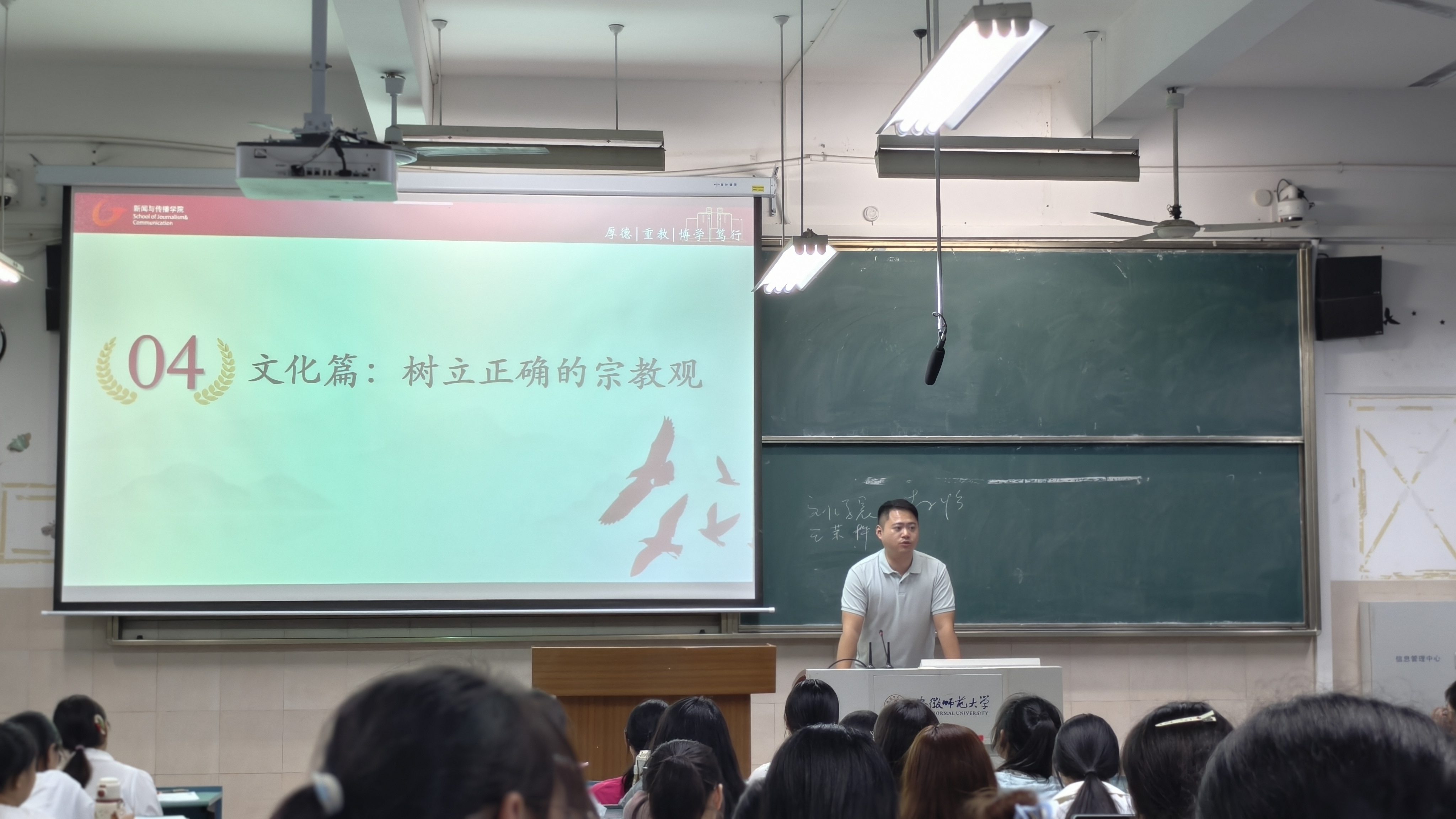 本网讯(新闻与传播学院 许梦云)2025年9月28日晚,2025级新闻学、广告学分别于行知楼2050302、2050304教室围绕“树立正确宗教观”开展专题教育。会议由辅导员刘成俊主持。