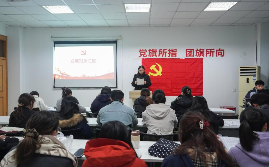 随后,会议进入接收预备党员环节。丁欣玥等八名发展对象依次登台,围绕个人思想成长、学业科研、实践经历、入党动机及未来规划等方面进行详细汇报。他们将专业学习经历和对党的历史使命、初心宗旨的深刻感悟相结合,讲述了如何以“人民至上、生命至上”的理念为指引,锤炼服务本领、践行责任担当。他们纷纷表示,在向党组织靠拢的过程中,深刻认识到党员身份不仅是荣誉,更是沉甸甸的责任,未来将以党员标准严格要求自己,把影视创作的传播力、航空服务的专业性与服务人民的宗旨相结合,在各自领域发光发热。每位发展对象汇报结束后,乌思琦、汪笑笑、王姿琪三位入党介绍人依次介绍了其培养考察情况,客观评价了发展对象的政治素养、学业表现、群众基础及存在的不足,并发表同意接收为预备党员的意见。与会党员围绕发展对象的综合表现展开充分讨论,提出针对性的改进建议。经现场所有正式党员无记名投票,一致同意接收丁欣玥等8名发展对象为中共预备党员。
