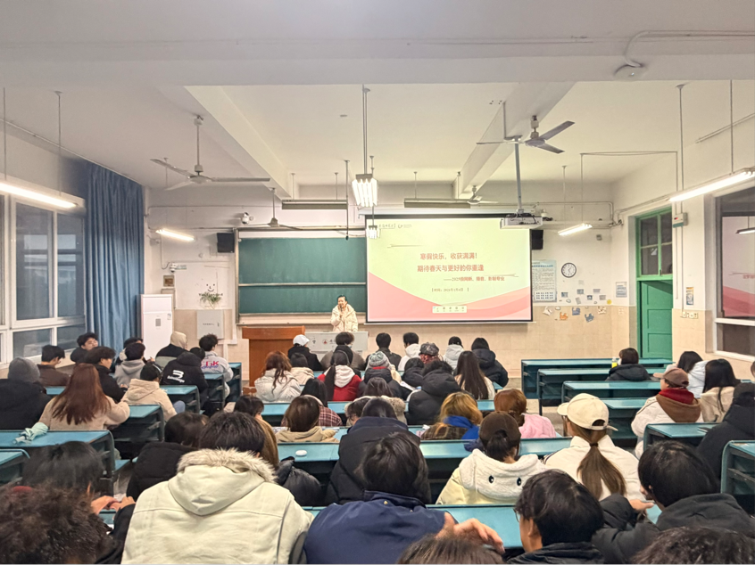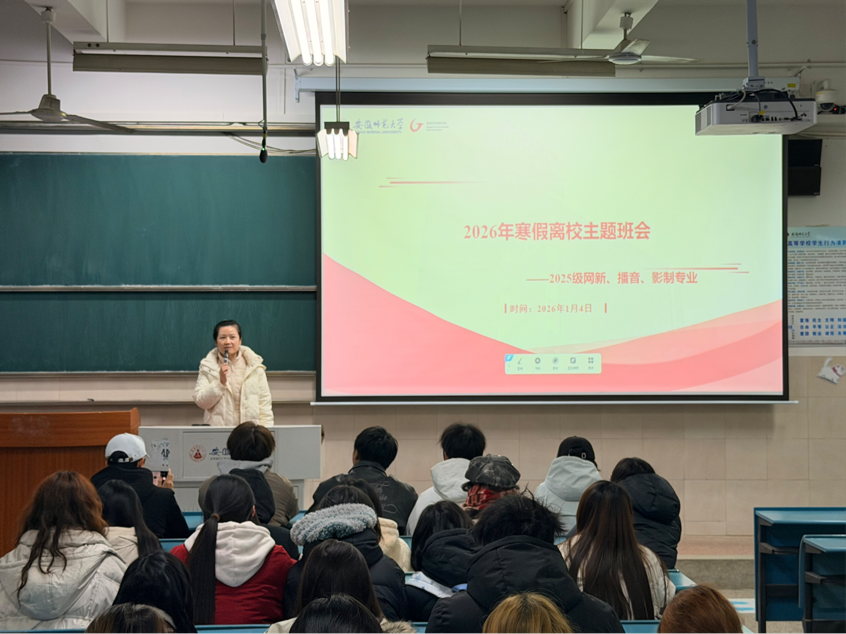 本网讯(新闻与传播学院 杨佳琪)为做好寒假离校相关管理工作,增强学生安全意识,保障学生平安度过假期,1月4日下午,新闻与传播学院2025级网络与新媒体、影视摄影与制作、播音主持艺术三个专业全体学生在行知楼2040304教室召开了寒假离校主题班会。会议由辅导员郑慧玲主持。